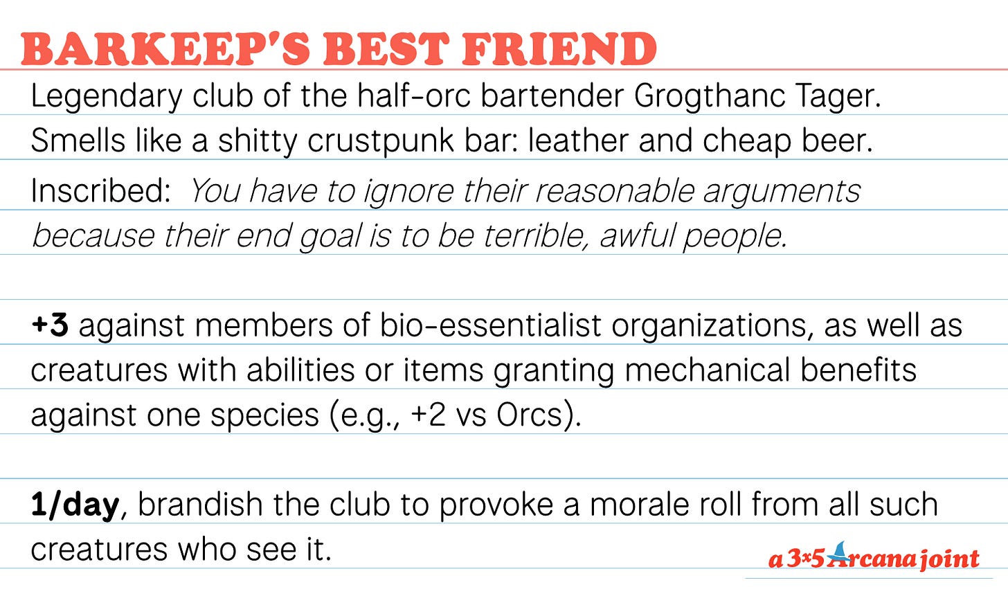 When I started a blog about dungeon stuff in a love-language of 3×5 index cards, I just used the first tool that I found, and that was Substack. But I’m moving, to blog.3×5arcana.com. I’m going to tell you why, and I’m going to give you a new magic item that fits on a 3x5 card.