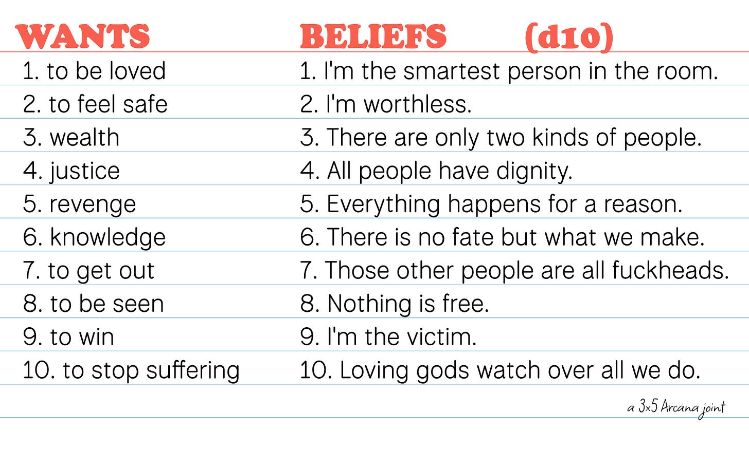 Of course, these beliefs are pretty generic. To create a specific sense of place, write a table of beliefs specific to the theme of your adventure! More on that in the next post.